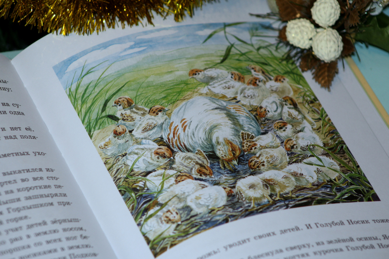 И все это Виталий Валентинович рассказывает так интересно! И фамилии у семейств куропаток есть, и интересно читать как муж куропаток гордиться и хвалит жену свою - Оранжевое Горлышко. И не зря хвалит, и умна она, и добра. Когда детки их друзей-соседей остались сиротами, она без раздумий их всех усыновила, хоть и своих было 24 птенца, а стало 44. Но дальше оказалось, что ее любви и заботы хватит не только на этих малышей. У дальних соседей погибла куропатка, остался отец одиночка. Трудно бы ему пришлось, но пришел он к семье Подковкиных и не отказали они ему в помощи. Так и стали три взрослых воспитывать огромный выводок птенцов, не разделяя на своих и чужих, всех любили одинаково.