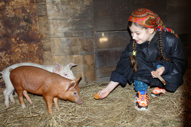 Да, в наше время скотину почти никто не держит. Настя когда видит в деревне чьих-то козочек, или гусей, то всегда радуется, приглядывается из далека.)) А тут свои собственные хрюши, нянчиться можно целыми днями!))