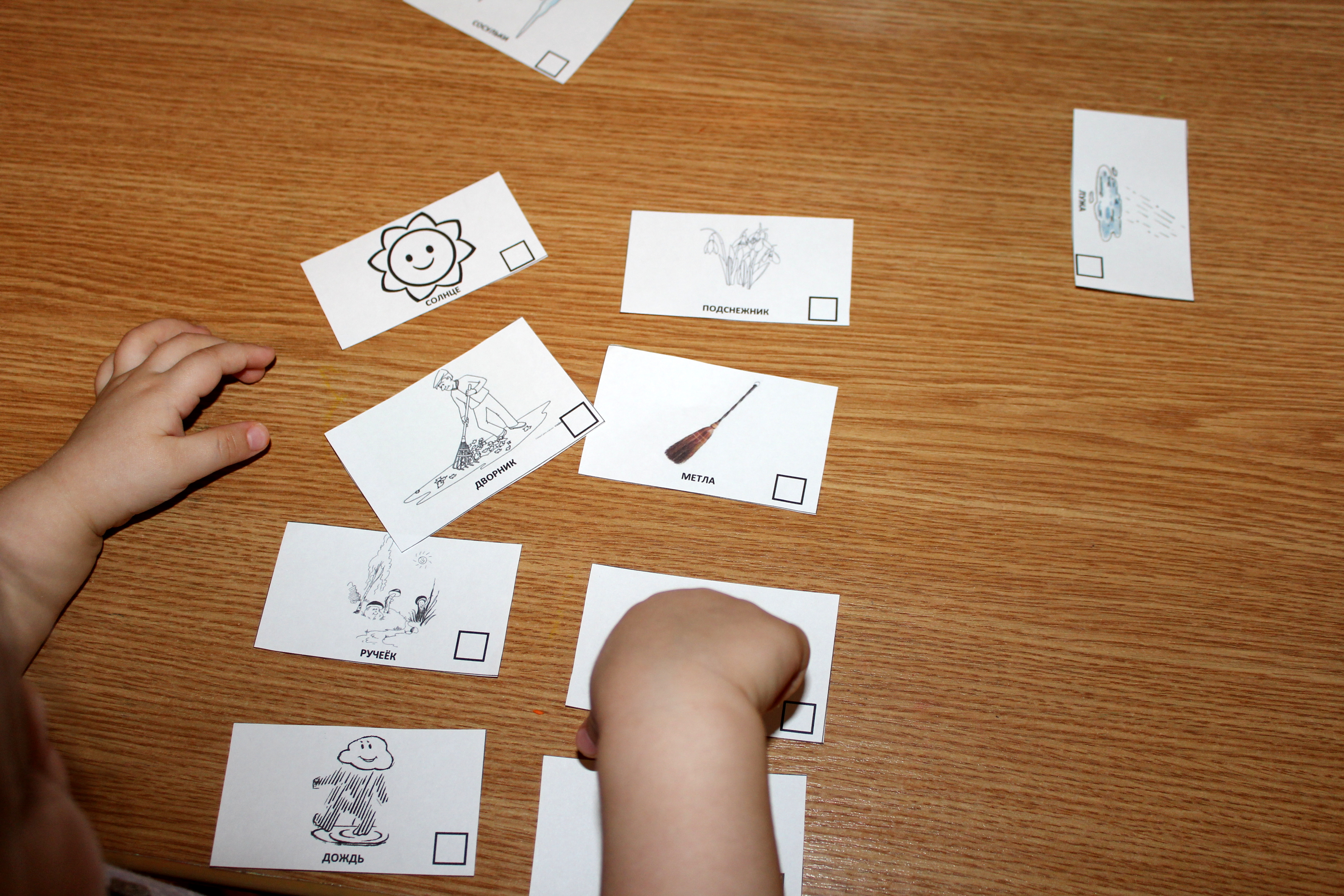 Соединяли карточки по парам и я рассказывала почему они составляют парочки