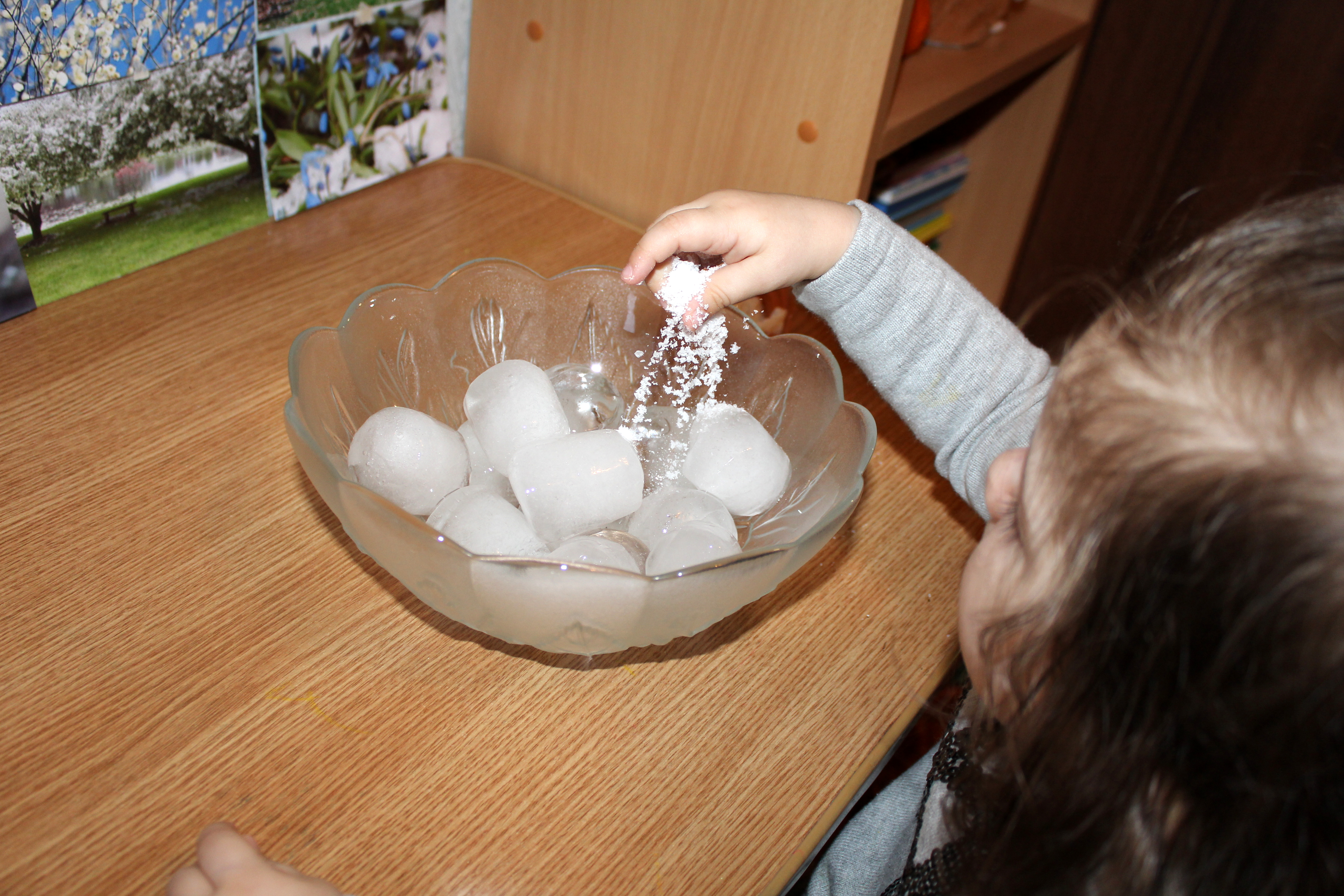 Я принесла лед и соль, решили в домашних условиях посмотреть как трещит и тает лед... но лед от соли совсем не трещал.... какой-то неправильный лед.. зато соль сыпали с удовольствием, сразу прибежал сыночек, игры со льдом он очень любит))