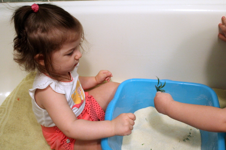 купила искусственную и закопала ее в 2 кг манки)) дочкам очень понравилось! Целый час возились! Сонечка быстро находила весеннюю травку, а Настену трава абсолютно не интересовала, она наслаждалась новыми тактильными ощущениями, брала горстями крупу и втирала себе в ноги