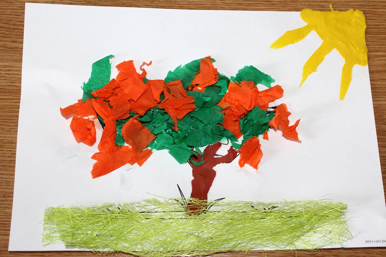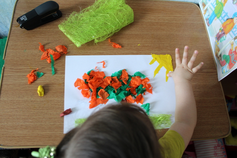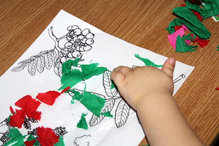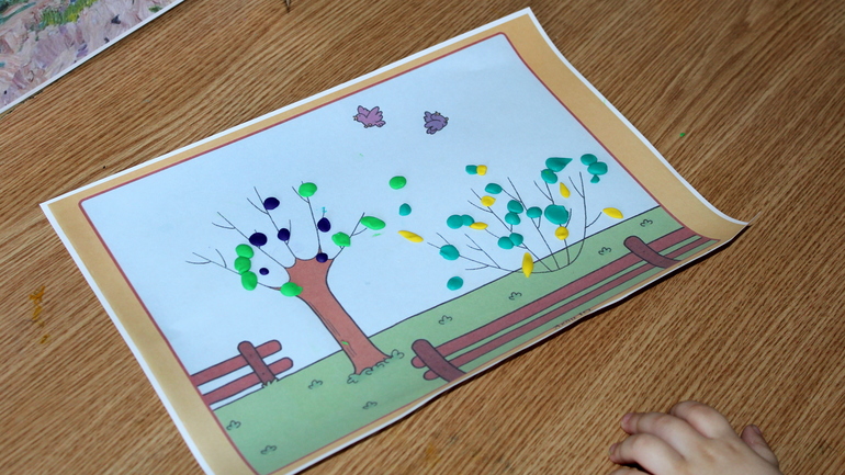 Во второй половине дня мы занимались творчеством)Сначала Сонечка приклеивала листики рябинеПотом девочки на перегонки придавливали "листики" из пластилина!