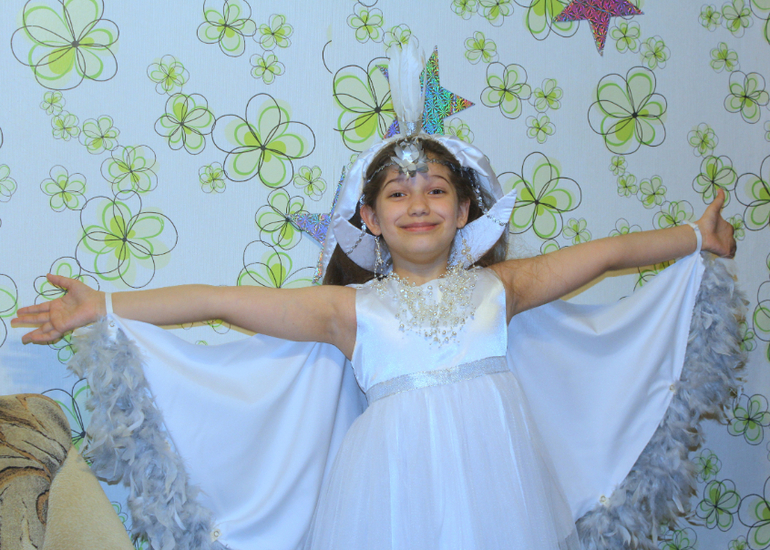 И тут случайно в сети я увидела костюм Принцессы- лебедя. Дочка как раз прочла сборник сказок Пушкина, и долгое время восхищалась красотой этой принцессы в рисунках Вячеслава Михайловича Назарука.