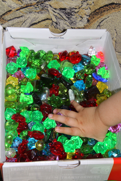 Для начала я выбрала из огромного нашего запаса стекляшек все зелененькие. К нам в гости пришла лягушка, она питалась только зеленой едой и Настя ее старательно кормила)))