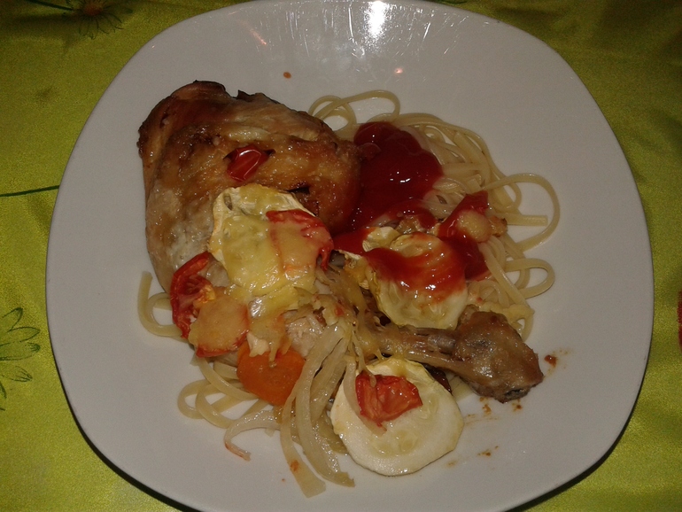 6 Спагетти, запеченое в духовке (помидорка , кабачек,лук репка,майонез,сыр с верху,помидора ,курица)