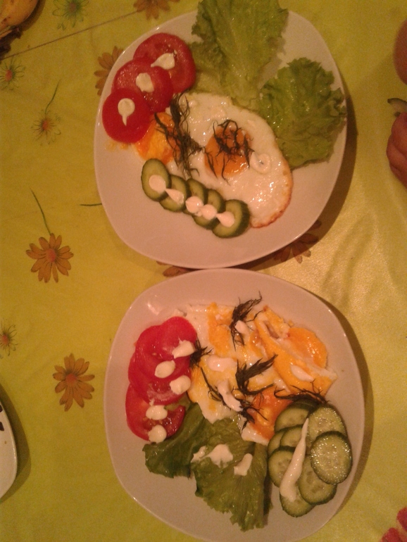 5.Веселый завтрак с яишенкой ,лист салата, майонез,укроп,помидорка,огурчик.