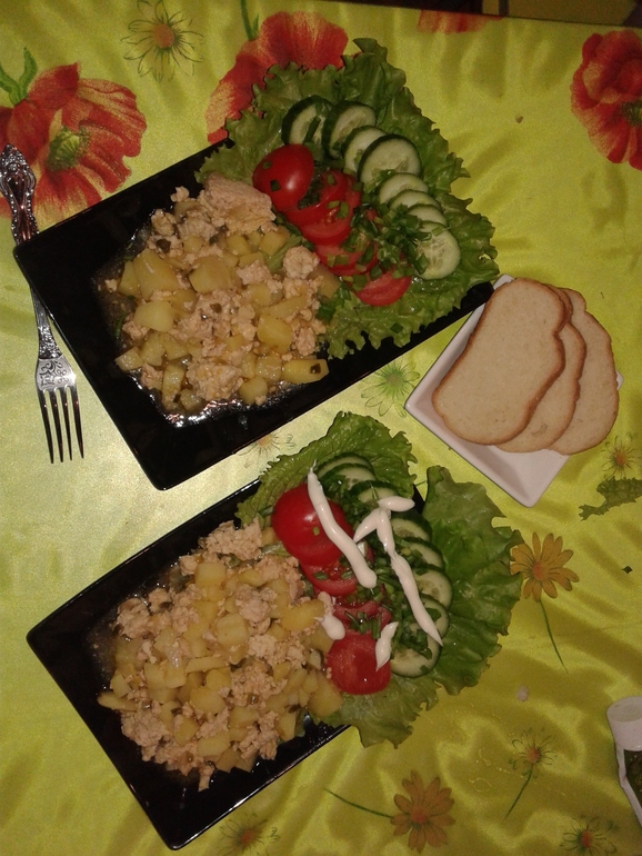 4. Тушеная картошка с мясом, лист салата, помидорка,огурчик и перо зеленого лука.