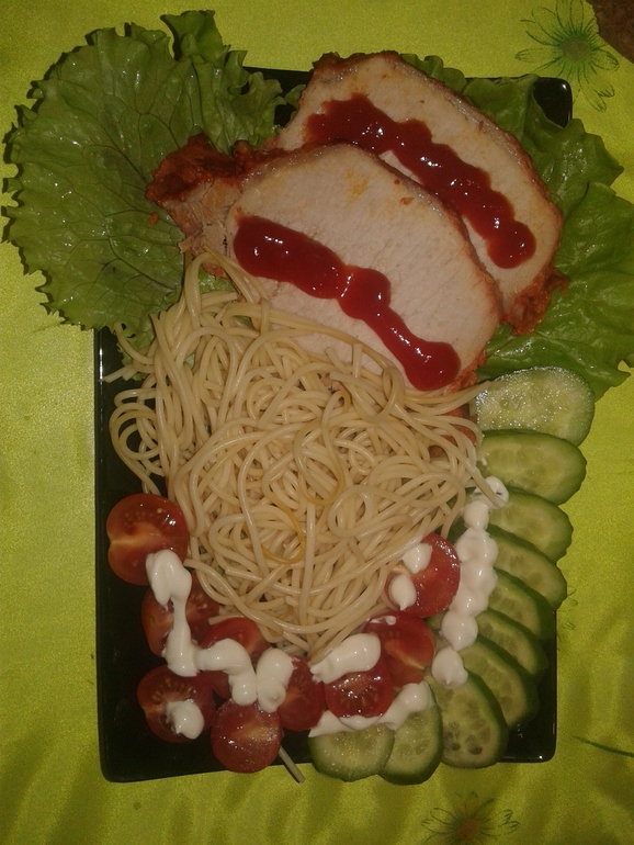 1. Спагетти с кусочками мяса(запеченое в духовке) ,листья салата, огурчик,помидорка черри.