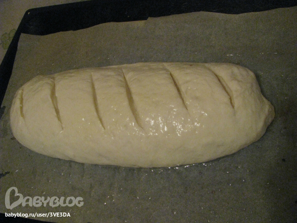 Далее смазываем хлебушек водой, делаем 5 косых поперечных надрезов и ставим в духовку.