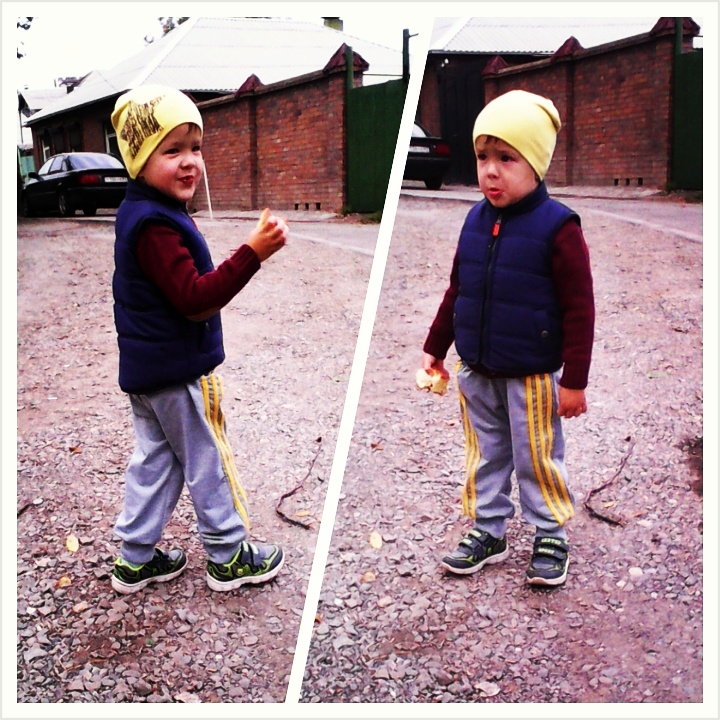 После полдника всегда голодные, а сегодня поесть вообще не успели, пришла в 16.45, а детки только проснулись и сидели на горшках и умывались. Дали булочку нам с собой. У нас уже традиция по дороге домой булки или пирожки есть.