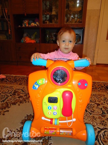 Как каталка дочка на ней так и не каталась.как ходунок тоже не понравился.дочка начанала идти и падала так как не успевала ногами перебирать нужно поддерживать рукой чтоб не разгонялся.зато как игрушка до сих пор играем.звоним всем и алло научилась говорить благодаря ей(хотя там по анг.)вообщем моя оценка два минуса и один+.лучше купить отдельно телефон и отдельно каталку удобную с рулем и прорезиненными колесами