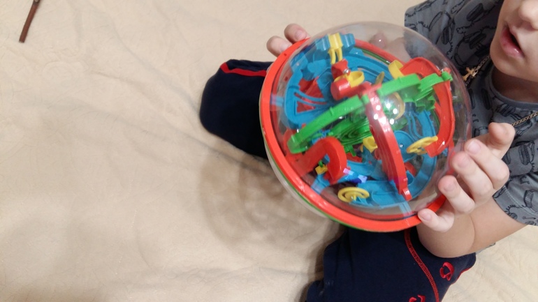 Привет! Это 3D лаберинт ты шарик катишь по дорожка и при этом крутишь шар что бы шарик катился. Нужно дойти до конца)) Пишут лет от 6! У нас есть один но он маленький на 100 ходов. ( они разные ) Сынуля попросил большой. Вот пришлось искать заказла 2 разных на НГ и на ДР! Я сама в него играю