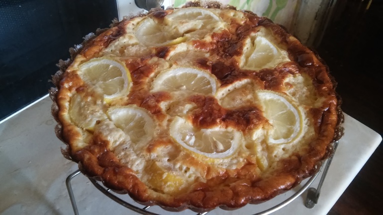 В силиконовую форму налейте слой теста, сверху выложите большую часть лимона. Далее налейте еще слой теста и украсьте верх оставшимся цитрусом.