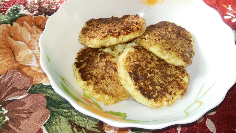 Смешать все ингридиенты кроме ПО, мокрыми руками сформировать сырники и немного обвалять каждый в отрубях. Жарить на медленном огне под крышкой с каждой стороны.