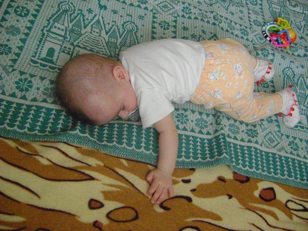 Моя бы уже в низу была с кухонного стола, она у нас насзад ползает))) И на животе не разу не спала.
