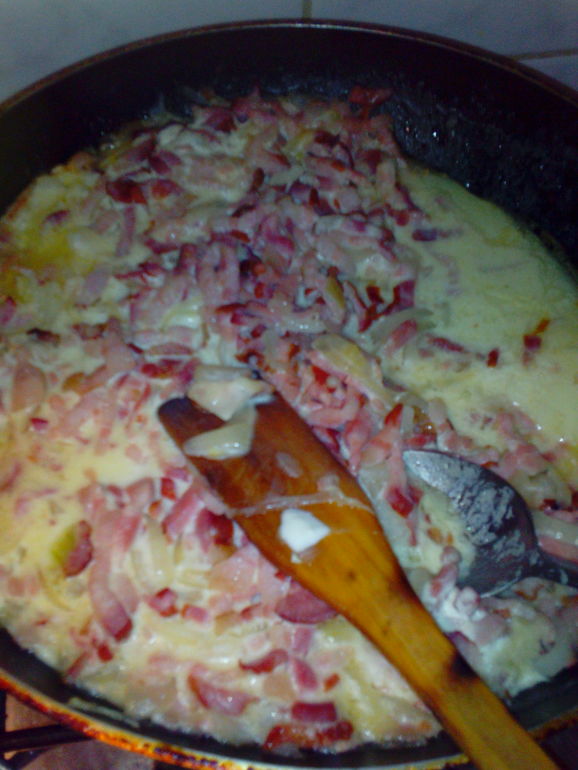 рецептик ооочень прост)) Покупаю грудинку свиную, копчёную (больше сала или мяса, это зависит от ваших предпочтений) лук и сметана. Нарезаю соломкой грудинку, лук полукольцами. Сначала обжариваю мясо, туда лук и в конце сметана, минутку ещё подержала на огне и всё) ну тааак вкусно!!!