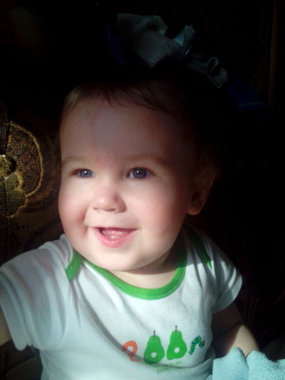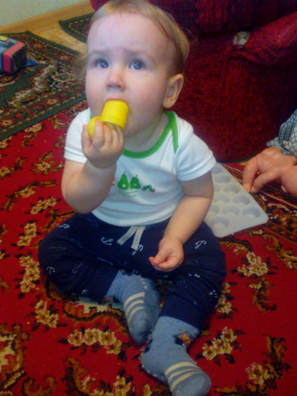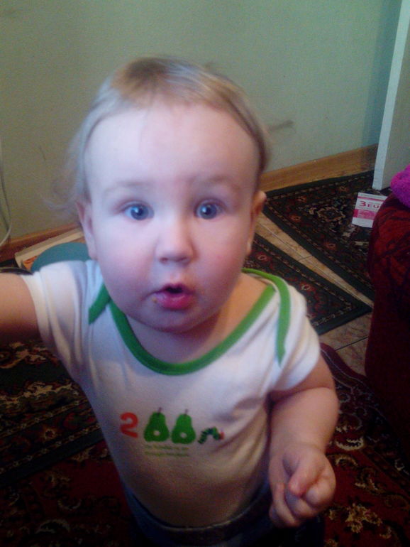 целых 11 уже! Вот время летит... Умеет быстро ползать, а вот ходить не хочет, только встает и стоит, хотя за руки если вести, то пойдет. Вчера отпускал руки от дивана и несколько секунд стоял. Говорит мама, баба ну и слоги. Умеет делать ата и дай. Любит играть со всем что есть
