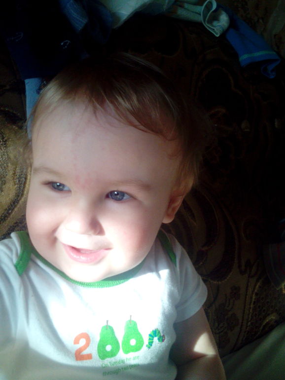 Улыбается во всю, разговаривает, погремушки любит, очень хороший мальчик, тьфу,тьфу,тьфу, нарадоваться не могу!!!
