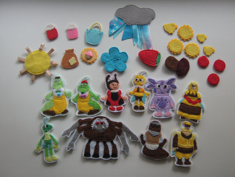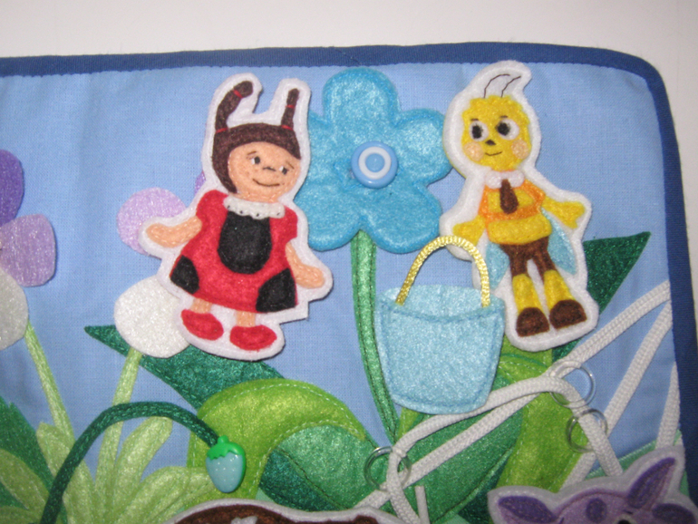 Мила и Пчеленок собирают пыльцу с цветочков в ведерко, большой цветок на пуговке