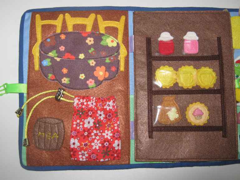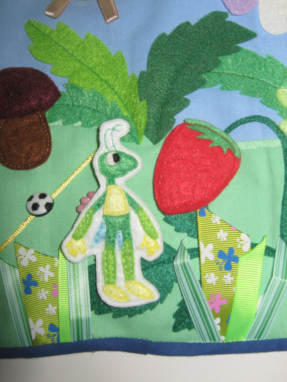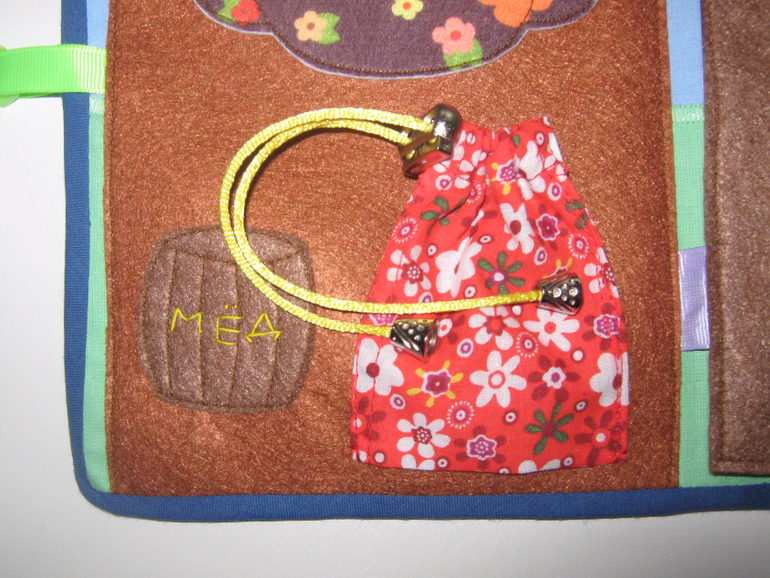 Улица, можно менять погоду, туча и солнце на липучке, ягоды клюквы на крючках, грибочек на кнопке, мячик можно катать по шнурку