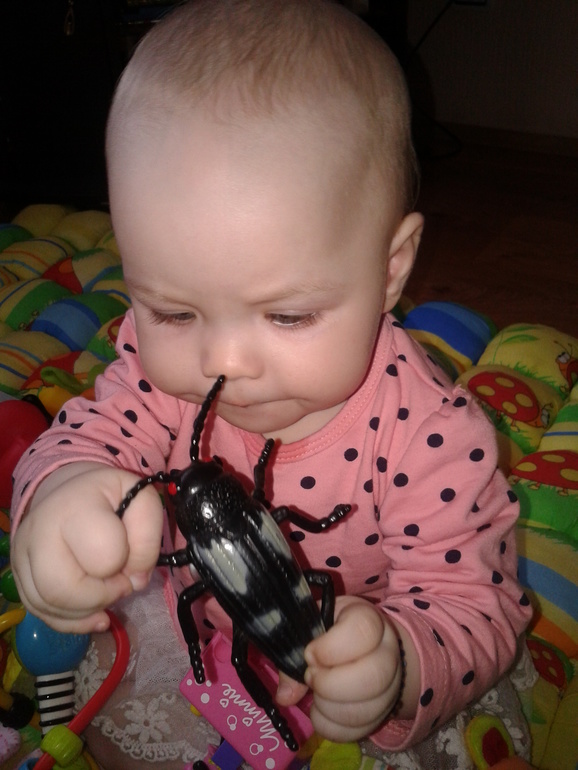 *** Сегодня моя красотень проползла на четвереньках по всей ширине разложенного дивана (примерно 1,5 метра) и встала на прямые ножки держась за спинку дивана ( если честно, то усердно ползла за кошкой, которая сперва спала у спинки дивана, а потом, заметив поползновения в её сторону, запрыгнула на спинку дивана)!!!! Это такой прогресс! Ура! И вообще, сейчас когда её ставишь на ножки- уже встаёт полностью на ступню, а не на цыпочки.... и если придерживать за подмышки- шагает)))