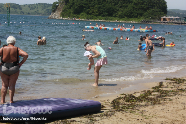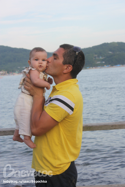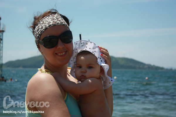 Вообщем създели мы на море!!! Все прошло хорошо! Кира всю дорогу спала, уже на месте конечно же разоралась в незнакомой ей обстановке, орала часа 2, мы думали нас из домика выгонят, но так как приехали мы уже вечером, то после купания и кормления она благополучно уснула до утра. Утром уже все было хорошо. Девочка наша уже совсем взрослая становится, все вокруг ее интересует, ко всему тянет ручки, а потом в ротик))) Немного помочили ей ножки в море, ей понравилось, и вообще ей на море было очень хорошо, за 2 дня никаких визгов и писков, хотя дома мы ноем и визжим, видать от скуки. Мы тоже нормально отдохнули, накупались, позагорали(я сгорела), шашлыки жарили, краба поели. Конечно вдвоем не так весело как с компанией, но еще все впереди, в августи едем с друзьями! Ну и фотки! А да и еще прекрасный отдых омрачает моя ужасная фигура!!!! НАДО ХУДЕТЬ!!!