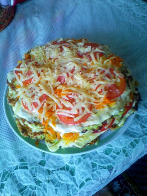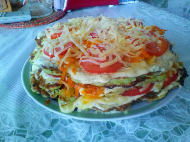 Пожалуйста)))))Вкуснейший тортик из кабачковПОНАДОБИТСЯ:4 – небольших кабачка2 – яйца200 гр – майонеза100 гр – сыра2- большие моркови2 – луковицычесночок, соль. перчик- по вкусумука- до консистенции теста как на оладьи2- помидорчика.ПРИГОТОВЛЕНИЕ : Кабачки помыть и почистить. Натереть на крупной тёрке,посолить, поперчить и дать немного постоять, пока кабачки выделят сок. Затем ихотжать, добавить яйца и муку. Жарить коржи на разогретой сковороде с небольшимдобавление растит. масла.ДЛЯ НАЧИНКИ : Лук мелко нарезать, морковь натереть на крупной тёрке. Обжаритьдо мягкости. В отдельной посуде смешать майонез с чесноком и укропом. Сырнатереть заранее. Помидоры нарезать тонкими кружочками. Я ими тоже перекладываюслои торта.Пока жарится очередной корж, на готовый мы намазываем слой майонеза с чеснокоми зеленью, выкладываем начинку из лука и моркови, разложить кружочки помидоров,посыпать тёртым сыром. Накрыть готовым , горячим коржом. Так повторить с каждымслоем ! Сыр плавится от только что испечённого коржа и скрепляет тортик.