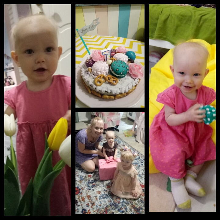 Мои родители и Таня с Алисой не смогли, к сожалению, приехать, поэтому отметили немного не по плану. Утром в игровой центр сходили, а когда папа пришел, Лилуша сама забыла свечку в пироженке (она умеет дуть, когда говоришь горячо, всегда дует))) .На следующий день была суббота и к нам пришли бабушка с дедушкой, друзья с детьми, повеселились от души. Я испекла мегаторт и черничные маффины, Лиле очень понравились кексы, я ей без крема давала. Нам подарили большую ферму и еще много денюшек, на которые мы до сих пор покупаем подарки : коврик-пазл, деревянная магнитная пирамидка, платье, планшет музыкальный...