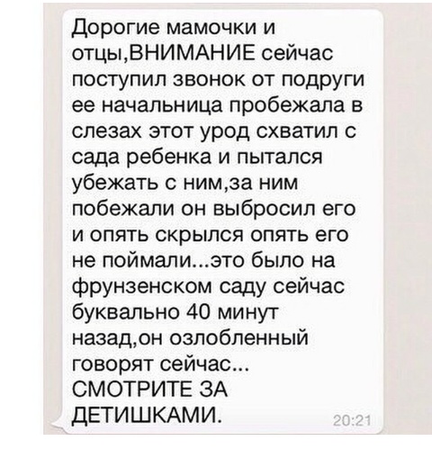 Боже,когда его поймают?ужас..не отдам свою в сад,пока этот убийца не будет пойман.. (Для незнающих:один урод,неделю назад похител девочку из сада и два дня назад нашли бездыханное тельте этой трехлетней малютки, а приступник не найден..)