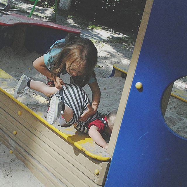 Моя новая любимая фотография:)для тех,кто говорит"тебе то проще с мелким, чем мне,у тебя помощница есть..",ага,есть:) одна помощь=+проблема:)Ева решила помочь Мише забраться в песочницу...1.Мишина моська в песке+рев 2.Ева тоже в рев,ибо страшно стало за брата #мистермама всех успокаивает:)