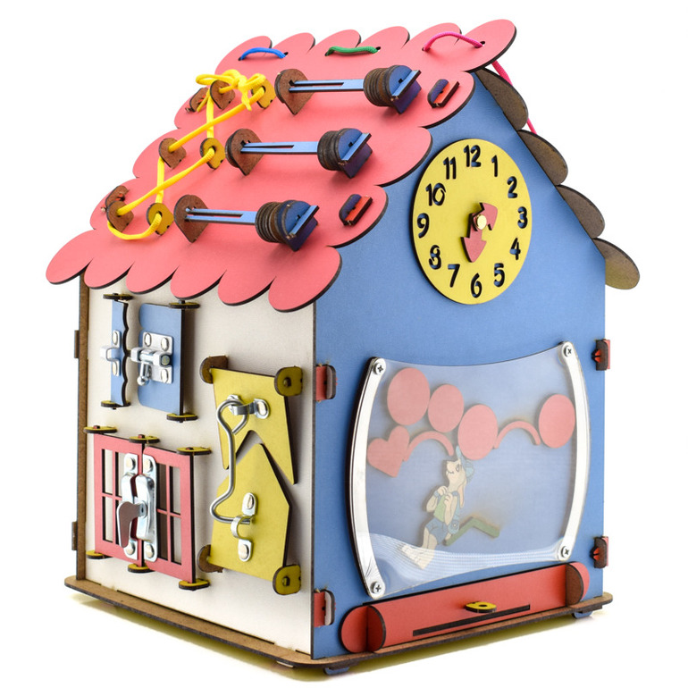 Все 4 стены домика оснащены развивающими элементами - дверцами с замками, часами, лабиринтом, шестеренками. Крыша тоже функциональна: на одной стороне расположены шнуровка и счеты, а на другой - яркий сортер. Бизи-Дом- это современная игрушка со всевозможными элементами, которые в обычной жизни маленькому ребёнку трогать запрещено. Во время игры малыш может крутить шестерёнки, двигать стрелочки часов, зажигать лампочку, вставлять вилку в безопасную розетку, щёлкать выключателем, проводить фигурку по извилистому лабиринту и многое другое. Лампочка работает от 3-х батареек типа ААА на 1,5 V (не входят в комплект).
