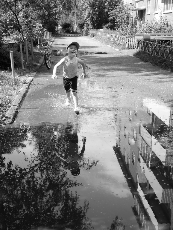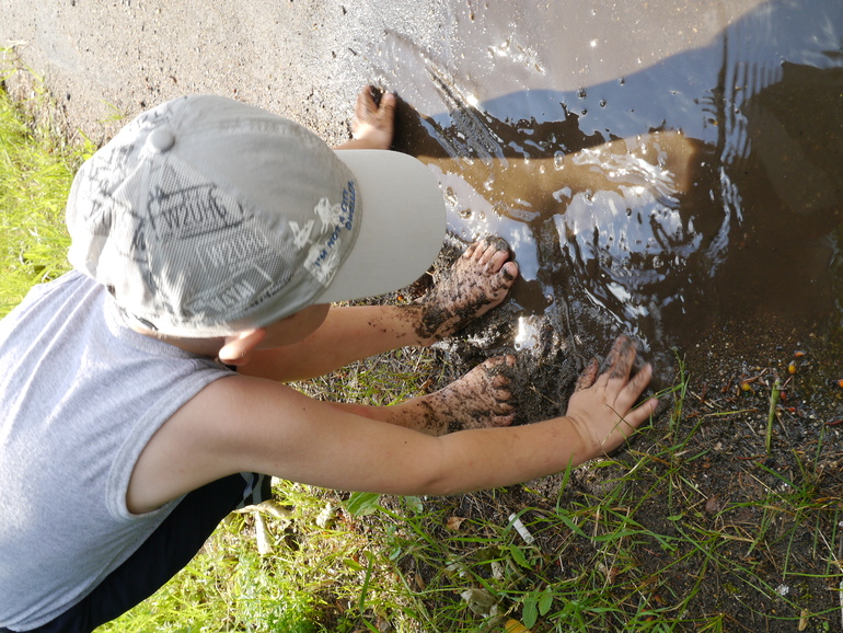 Дети же! Погода пазваляла и дом рядом, в общем почему бы и не покупаться в луже!Я сама кайфанула, вспомнила детство!