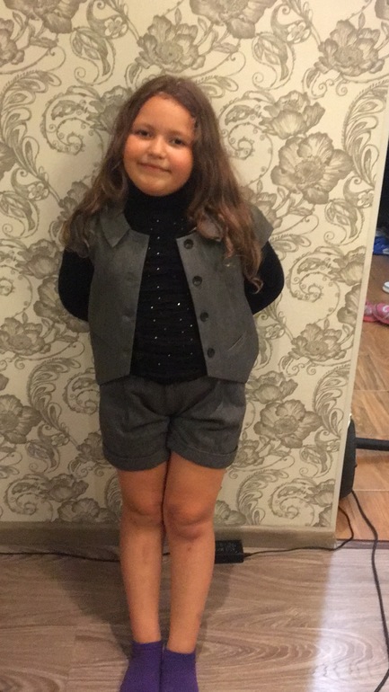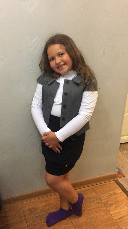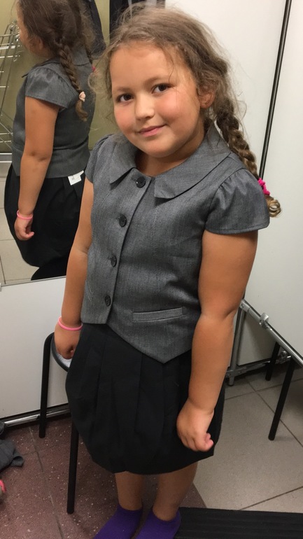 Доброй ночи! Девушка у Вас супер! Обаяшка и очаровашка! Не надо шорты в школу! Первоклашка же! Добавьте в гардероб сарафан - они бывают на разную полноту. Ну и юбки сюда же.