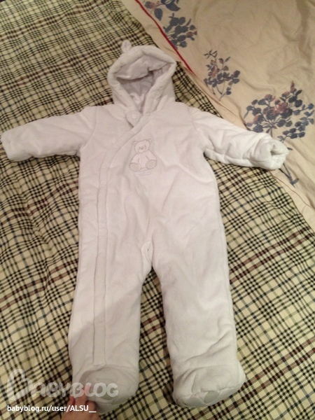 Цвет белый.Размер 86 на 12-18 месяцев.Теплый, мягкий , на синтепоне , с ручками (на пуговках). Кофточка и джемпер в подарок.