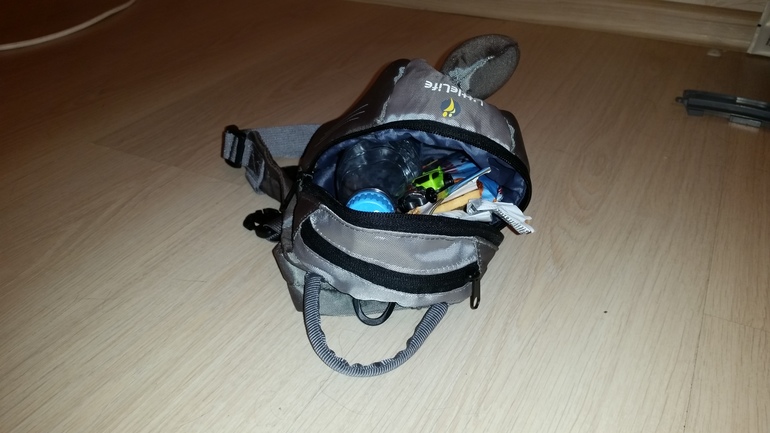 Нам крупно повезло, наш рюкзак оказался серого цвета и сын тут же отметил это: " Как у папы! Мама! Гляди!!!". Девочки и мальчики, если они тут есть, вы же понимаете, как круто, когда что-то как у папы? Это же высшая похвала. В первый день мы не снимали рюкзак даже за обедом. Весь день мы складывали и вынимали из него разные вещи и ни как не могли решить что же сын будет в нем носить. Ажиотаж такой я видела раньше только от игры в лего вместе с папой. На второй день мы ходили в поликлинику. Я, Митя на моих руках, мой прогулочный клатч(телефон, ключи, помада - остальное "мамское" обычно лежит в коляске), Алеша и теперь его рюкзак был с нами. Утром было принято верное решение - юный стратег сложил туда машинку небольшую, пол пачки юбилейного и водичку. Этот нехитрый скарб просто развязал мне руки! Пока Митя проходил диспансеризацию и носила его из кабине в кабинет, Леха полностью себя обслужил сам - перекусил, попил и поиграл в коридоре, не дергая меня поминутно на "дай-подай".