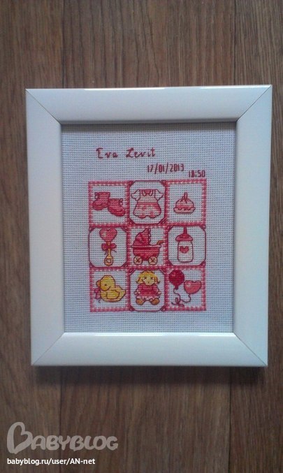Возможно, не все так идеально, но я горда тем, что это моя первая оформленная работа. Она уйдет в подарок новорожденной Евочке - доченьке моей подружки!