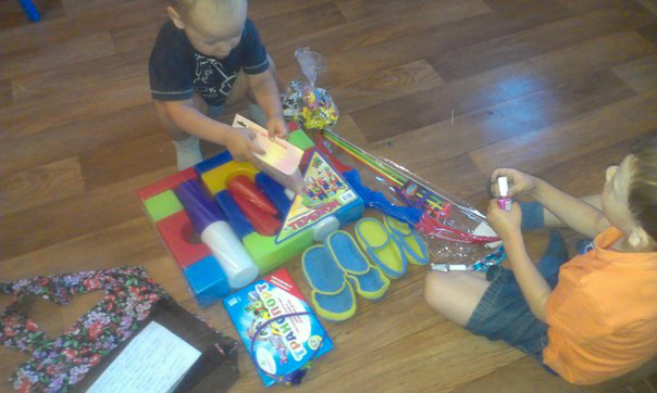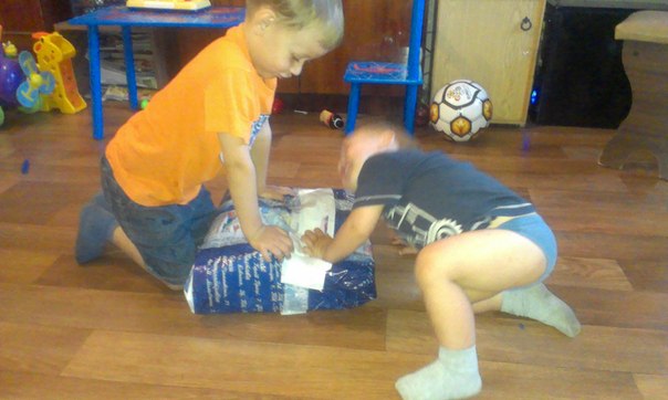 Получили мы посылочку вчера вечером вдвоем с Тимошей, т.к. Ясик уехал с родственниками в сад за черешней. Пришли домой и твердо решили дождаться Яську: