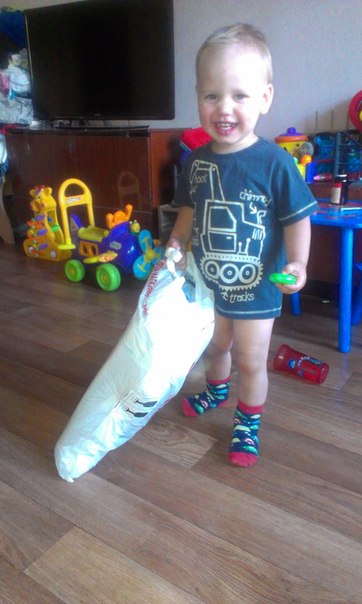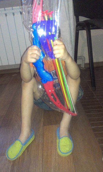 Ясик остался очень доволен игрушкой - дурачился весь вечер - натянул тапки (по размеру ему подошли меньшие, но это не страшно - дорастет) отказался их снимать - понравились))) Они такие мягенькие - сама бы носила))