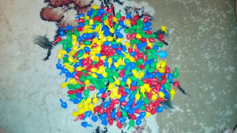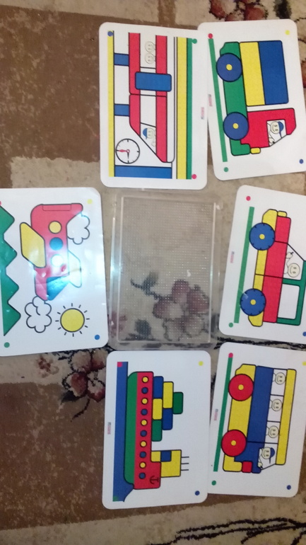 В комплект входят:прозрачная доска из оргстекла с отверстиями, 300-350 фишек четырех основных цветов (красный, желтый, синий, зеленый) и 6 плотных глянцевых карточек с образцами узоров-картинок (поезд, самолет, кораблик, автобус, легковая машина, грузовик).