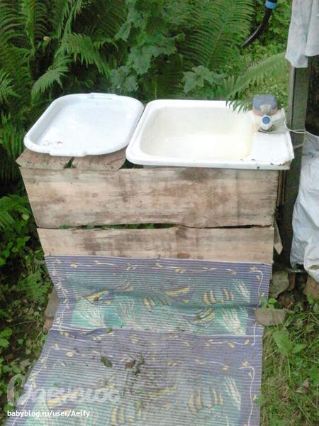 Ну еще по мелочи,столик для уличного умывальника.Еще в том году тут один кран висел,даже раковины не было))