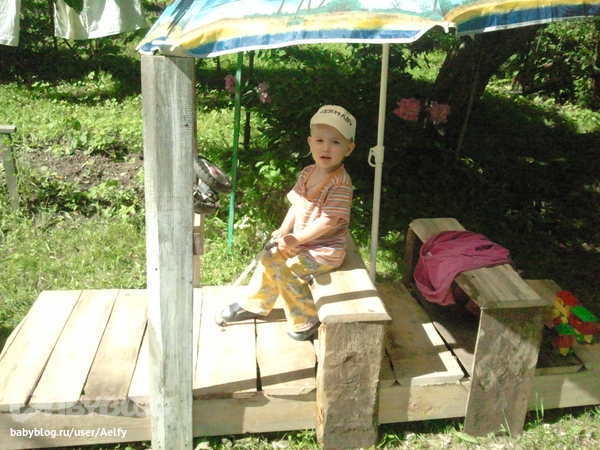Я вот сделала детям подобие деревянной машины,как на детской площадке.4х местная,руль,все как положено.Вместо крыши-раскрытый садовый зонт.Дети в восторге!Особенно младший)))Гоняет старших оттуда))Кричит "Моя машина!!!"