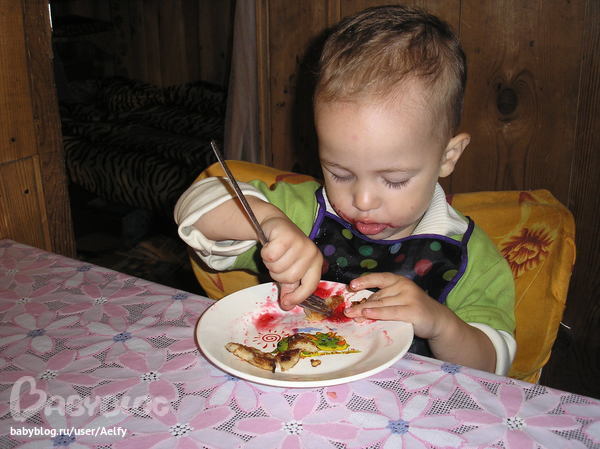 Любит мой младшенький)))Если это большие блины,то я ему мажу вареньем и скручиваю в трубочку.А сейчас напекла яблочных оладушек(тертые яблоки+яйцо+сахар+мука),так их на кусочки порезала.Вилкой цепляет,в варенье макает,кушает))