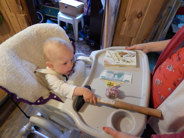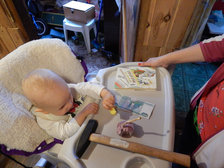 Книга-ум,деньга-богатство,конфета-сладкая жизнь,чеснок-здоровье,молоток-домовитость.Сын сделал интересеый выбор))))Сначала пощупал молоток...