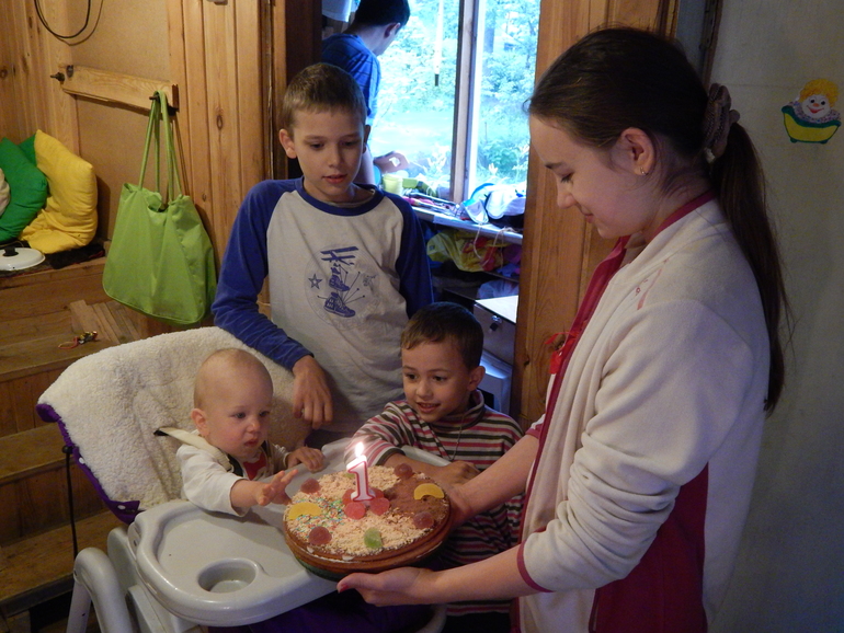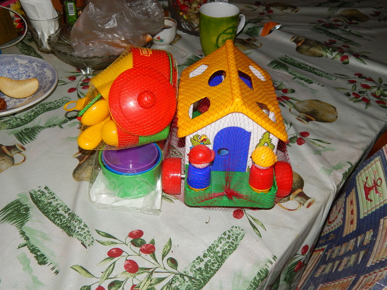 Да еще и в такую погоду...Дождь,14 градусов, ветрище,на улицу даже в окно смотреть страшно,не то,что гулять.А если при этом еще и на даче,то вообще брррр.Так что наше отмечание свелось к тортику и чаю.Подарки утром облизали,свечку вечером задули)))
