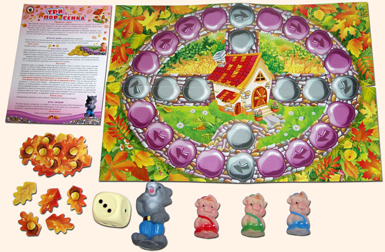 В правилах описаны два варианта игры - без волка и с волком. В первом случае игроки-поросята просто бегают по круговой дорожке и стараются отыскать желуди среди опавшей дубовой листвы. Кто первым соберет 5 штук, тот и победит. Если ваш малыш никогда раньше не играл в настольные игры или сильно затрудняется с принятием самостоятельных решений, то лучше начать с этих более легких правил.