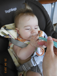 А мы едим пока капусту)) "едим" это громко сказано)))) научился её выплёвывать аж на расстоянии метр от себя!!! Папа хахочет , глядя на это зрелище, а я уже злюсь))) кухню то мне мыть))))