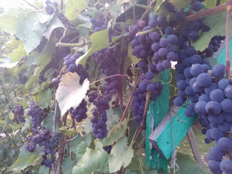 У нас есть в другом месте Изабелла, но уже старенькая. Будем убирать. А это мы даже не знаем. Но тоже винный сорт. Не для еды. Мама будет вино делать.