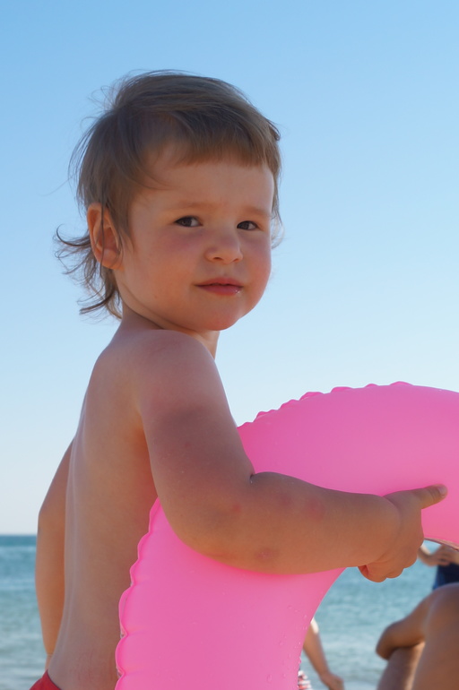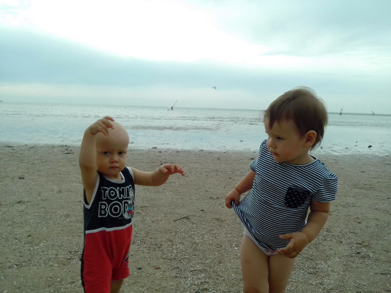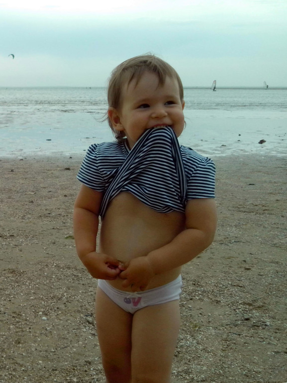 PS В конце июля были в Рожке. Пляж там не понравился - ракушечник + большие колючие камни по краю воды - метра три. Т.о. Зайти в воду очень тяжело. Ребенку босиком гулять по краю воды не возможно, но Алиса в своих резиновых тапочках хорошо играла с этими камнями - кидала их в воду. Ко всему был сильный ветер и почему-то очень мутная вода, поэтому даже фотографировать не стали.
