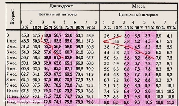 Дома Алиска продолжала так же спокойно спать до 4-х часов подряд и даже когда я упорно старалась ее накормить грудью. Но неделе к 3-ей ребенка начали активно беспокоить газики, ни плантекс ни эспумизан ни беби-кальм не давали никакого эффекта и тут дите перестало спать и начало есть! активно кушать сисю, благо нынче врачи одобряют кормление "по требованию" и это требование стало проявляться чуть ли ни каждые пол часа )) Но все равно при взвешивании у педиатра в месяц оказалось что набрали мы всего ничего, итого получилось 3100 + непроходящая желтушка, вобщем немного по врачам побегать пришлось. Желтушка прошла к 2м месяцам и вес тоже пошел в гору. Примерно так: