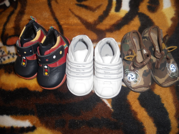 У нас все хорошо. Встаем у опоры, пытаемся ходить за ручку, поэтому прикупили первую обувку. Ботиночки, кроссовки и сандалики. На фото как-то не очень получилось, на самом деле они симпатичнее))